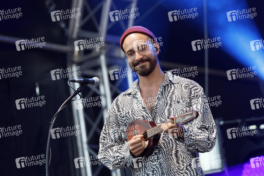 Daniel Avi Schneider von der Band Bukahara live im Kulturgarten in der Bonner Rheinaue. Das Bonn Live Kulturgarten Open Air Festival 2020 ist Europas erstes Open Air Musik Festival unter Corona-Auflagen wegen der Covid-19 Pandemie. Bonn, 21.07.2020
