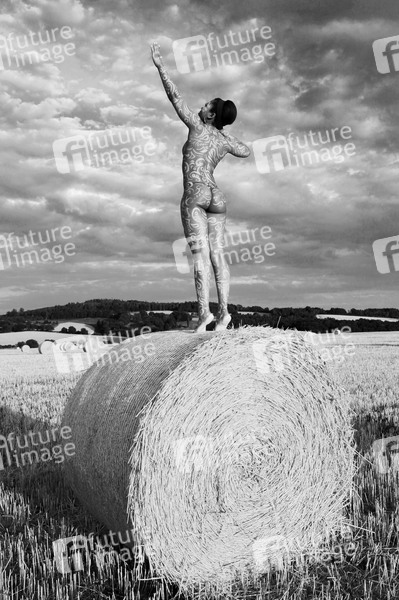 Bodypainting, Erotik, Frau, Mädchen, Afrikanerien, nackt, draußen, weiblich, Körperkunst, Kunst, Ornamente, Malerei, Feld, Acker, Stoppelfeld, Heuballen, Stroh, Landwirtschaft, Ernte, Abendsonne, erotic, African woman, girl, nude, outdoor, female, body art, body painting, ornaments, field, hay, straw, farming, harvest, evening sun