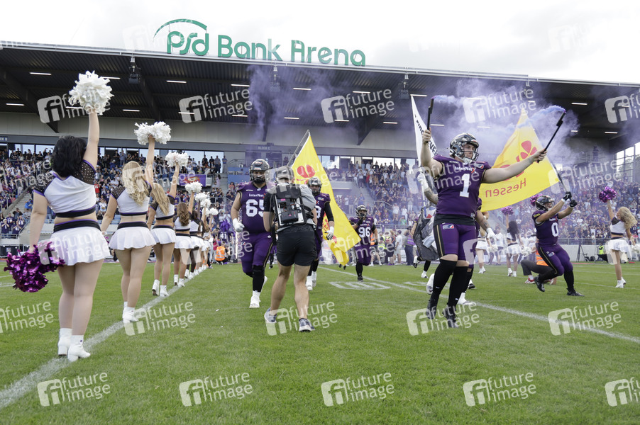 Luca Hebel (65), Denis Butz (96), Ryan Rimmler (1) und Cristian Santos Insua (0) beim American Football-Spiel Frankfurt Galaxy gegen Cologne Centurions in der PSD Bank Arena Frankfurt. Frankfurt am Main, 13.07.2024