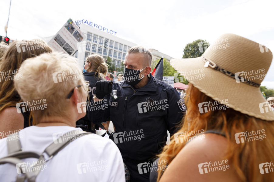 Demonstranten verschiedener Gruppierungen wie etwa der Initiative Querdenken 711 protestierten mit einer Großdemonstration in Berlin gegen die bestehenden Maßnahmen zur Eindämmung der Corona-Pandemie. Wegen Nichteinhaltung der polizeilichen Auflagen wurde die Demonstration durch die Polizei beendet. Es gab Rangeleien und Festnahmen. Berlin, 29.08.2020