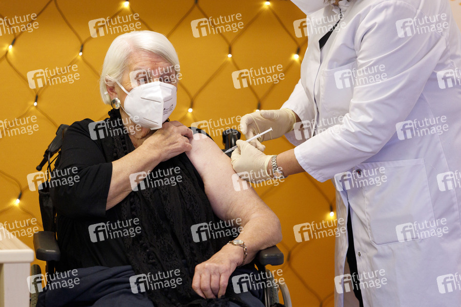 Gertrud Vogel beim Fototermin zum Impfbeginn in Köln. Zum Impfstart in Köln werden Senioren und Mitarbeiter der Kölner Sozialbetriebe mit dem Corona-Impfstoff von Biontech Pfizer geimpft. Als erste Kölnerin erhielt die 92-jährige Gertrud Vogel, eine Pflegeheimbewohnerin des Seniorenzentrum Riehl das Vakzin. Köln, 27.12.2020