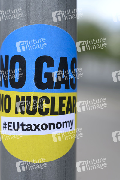 Aufkleber als Protest zum delegierten Taxonomie-Rechtsakt über Kernenergie und Gas. Das Mehrheit der EU-Parlament hat dafür gestimmt, Investitionen in Gas- und Atomstrom unter bestimmten Bedingungen als nachhaltig zu klassifizieren. Damit folgt sie dem Vorschlag, den die Europäische Kommission Anfang Februar als ergänzenden delegierten Rechtsakt Straßburg, 06.07.2022