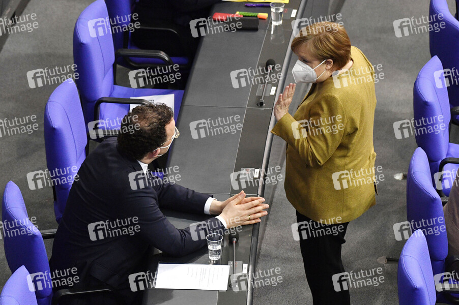 Jens Spahn und Angela Merkel in der 215. Sitzung des Deutschen Bundestages im Reichstagsgebäude. Berlin, 04.03.2021