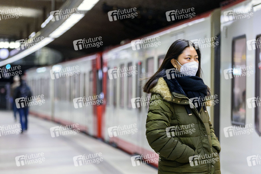 Die FFP2-Maskenpflicht gilt für öffentliche Nahverkehrsmittel wie Busse und Bahnen (einschließlich Bahnhöfe und Haltestellen) sowie für den Einzelhandel in Bayern. Im Bild U-Bahn Haltestelle Schoppershof (Symbolbild, Themenbild, Model Release) Nürnberg, 14.01.2021