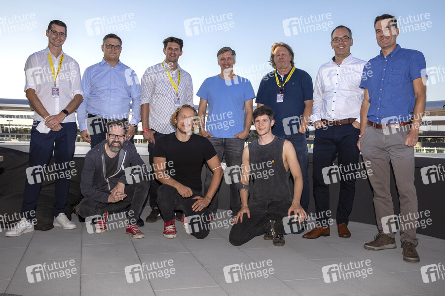 Benedict Vandamme, Alexander Weise, Rene Schwiers, Tom Kulik, Florian Peil, Bastian Campmann, Sebastian Wagner, Roland Kulik, Torsten Schrank, Stephan Merkens bei der Pressekonferenz vor dem OpenAir-Port Festival 2021 am Flughafen Köln/Bonn. Köln, 02.09.2021