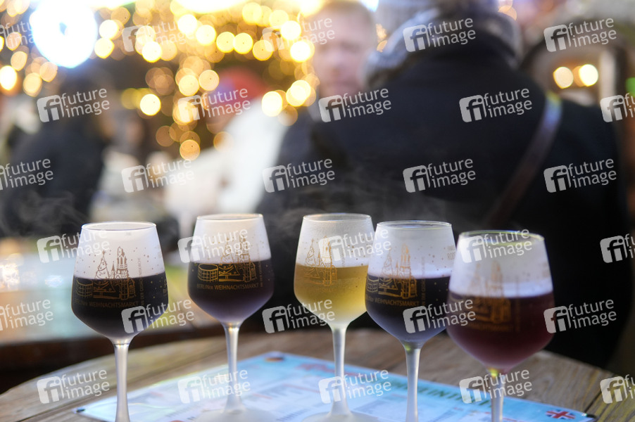 Glühweingläser mit Glühwein auf dem City-Weihnachtsmarkt an der Gedächtniskirche auf dem Breitscheidplatz. Berlin, 16.12.2024