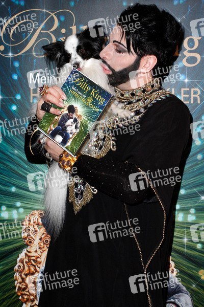 Hund Billy King und Harald Gloeoeckler bei der Buchvorstellung 'Billy King - mein Leben mit Harald Glööckler'. Berlin, 28.02.2013