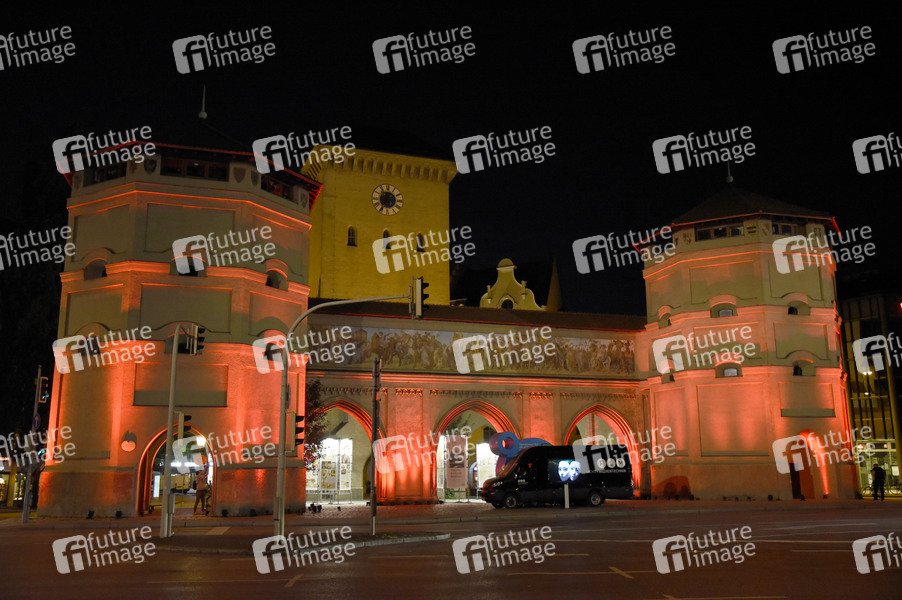 Beleuchtetes Isartor - Mit der bundesweiten Aktion 'Night of Light' macht die Veranstaltungsbranche auf ihre finanzielle Notlage durch die Corona-Krise aufmerksam. München, 22.06.2020