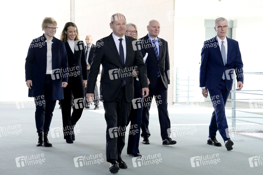 Veronika Grimm, Ulrike Malmendier, Olaf Scholz, Monika Schnitzer, Achim Truger und Martin Werding bei der Übergabe des Jahresgutachtens 2022/2023 des Sachverständigenrates zur Begutachtung der gesamtwirtschaftlichen Entwicklung an den Bundeskanzler im Bundeskanzleramt. Berlin, 09.11.2022