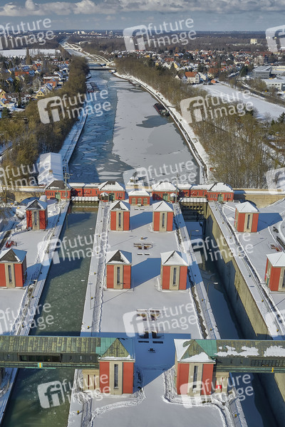 Schleuse Anderten, Wetter, verschneit, Schnee, Glätte, Eis, kalt, Wintereinbruch, Minustemperaturen, Winter, Winterwetter, Grenzwetterlage, Schneefälle, Schneefall, Frost, Wetterlage, Schiffahrt, Binnenschleuse, Kanal, Gewässer, Eisschollen, Drohne, Drohnen, Kameradrohne, Drohnenaufnahme