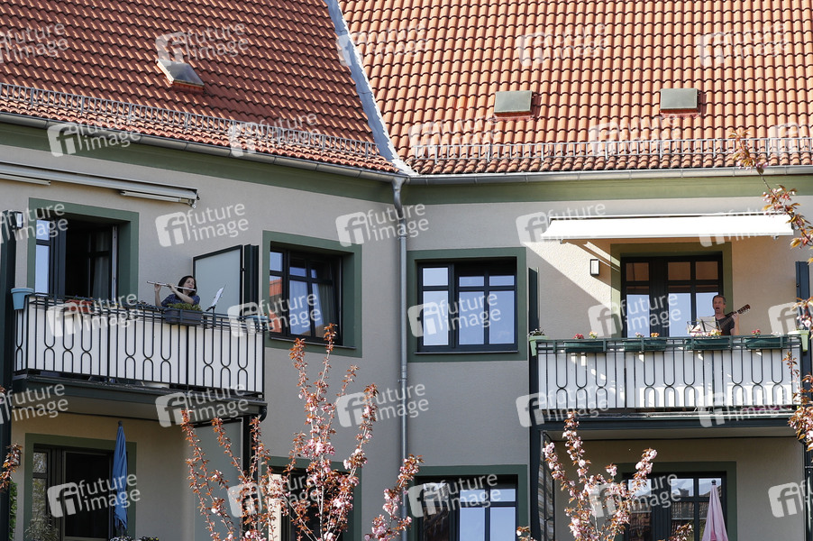 Jeden Abend geben Maria Petrowa (Querflöte, Chorsängerin an der Oper Halle) und Ulrich Duelli (Gitarre, Physiotherapeut) auf ihren Balkons in einem Wohnhaus am Landrain ein ca. 15minüges Konzert für die Hausbewohner und Nachbarn und vor allem für die dort lebenden Senioren, die sich während der Coronakrise in Selbstquarantäne befinden. Halle (Saale), 17.04.2020
