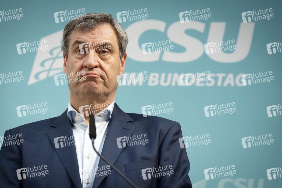 Markus Söder bei einer Pressekonferenz der CSU in der Vertretung des Freistaates Bayern beim Bund. Berlin, 25.02.2025