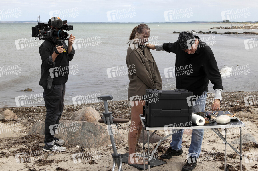 Nature Art: Ostseestrand Bodypainting und Photoshooting mit Model Katey an der Ostseeküste am Behrensdorfer Strand. Begleitet wird die Körperkunstaktion von einem Filmproduktionsteam aus Hamburg für einen dokumentarischen ARD/NDR-Fernsehbeitrag. Behrensdorf, 31.08.2022 - Bodyart-Künstler: Jörg Düsterwald
