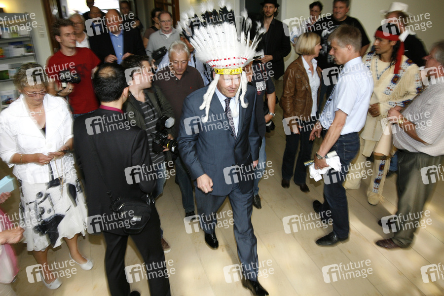 Das Ensemble der Karl-May-Spiele 2009 nimmt Ministerpräsident Wulff in den Kreis der Ehrenhäuptlinge auf. Dazu fanden sich die Mitwirkenden von 'Der Schatz im Silbersee' in der Niedersächsischen Staatskanzlei in Hannover ein.