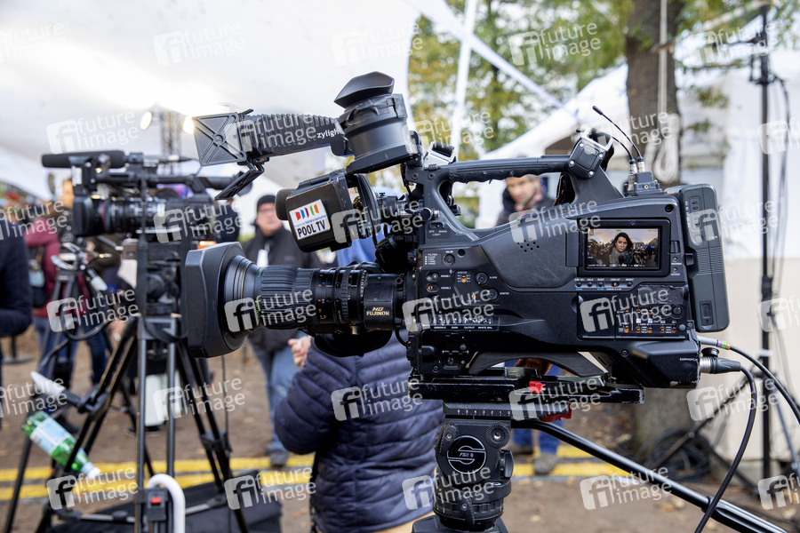 Kamerateams bei der Einweihung des Denkmals für die im Auslandseinsatz getöteten französichen Soldaten im Eugénie-Djendi-Garten im André-Citroën-Park. Paris, 11.11.2019