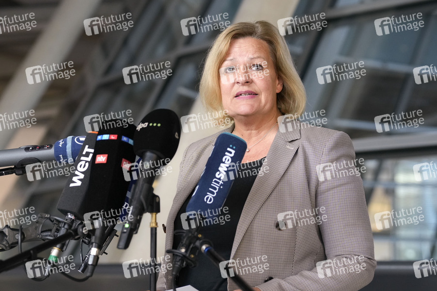 Politik, Statement, Pressekonferenz, PK, Reichstag, Deutscher Bundestag, Demokratie, Parlament, Parlamentsgebäude, Volksvertreter, MdB, Mitglied des Bundestages, Abgeordneter, Politikerin, Bundesministerin des Innern und für Heimat