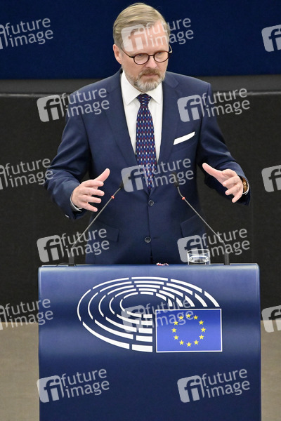 Petr Fiala präsentiert die Prioritäten der tschechischen EU-Ratspräsidentschaft im Plenarsaal des Europäischen Parlaments. Das Motto der tschechischen Ratspräsidentschaft lautet 'Europa als Aufgabe'. Das Motto unterstreicht die Notwendigkeit, die derzeitige EU-Politik im Lichte des russischen Angriffskrieges gegen die Ukraine neu zu bewerten. Straßburg, 06.07.2022