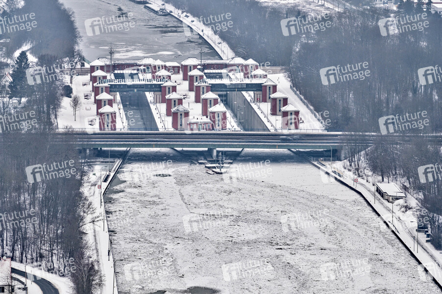 Hannover Anderten, Kanal, Wasserstraße, Gewässer, Eis, gefroren, zugefroren, Schneetreiben, Winter, gefrierende Nässe, Kälteeinbruch, Schneefall, Schnee, Schneegrenze, Schneematsch, Glätte, glatt, Frost, Wetter, Glättegefahr, Glatteis, Glatteisgefahr, Temperatursturz, Winterdienst, Streusalz, Schneeglätte, Deutscher Wetterdienst, winterlich, kalt, Schnee-Chaos, Luftaufnahme, Luftbild, Drohne, Drohnenaufnahme, Themenfoto, Symbolbild, Themenbild, Symbolfoto