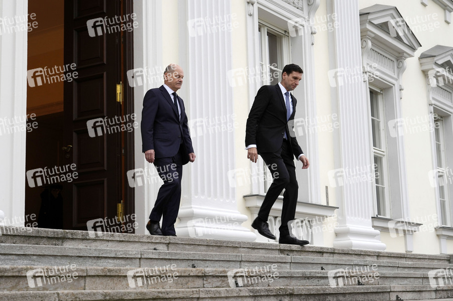 Olaf Scholz bei der Übergabe der Entlassungsurkunden gemäß Artikel 64 Abs. 1 Satz 1 des Grundgesetzes auf Vorschlag des Bundeskanzlers an den Bundesminister der Finanzen Christian Lindner, dem Bundesminister der Justiz Marco Buschmann und der Bundesministerin für Bildung und Forschung Bettina Stark-Watzinger sowie der Ernennungsurkunden für den neuen Justizminister Volker Wissing und den neuen Finanzminister Jörg Kukies im Schloss Bellevue. Berlin, 07.11.2024