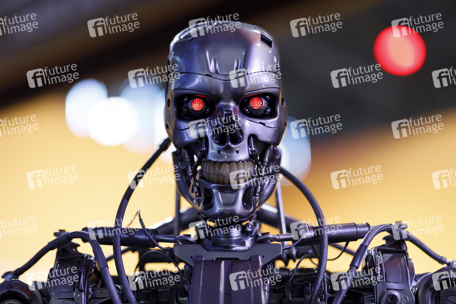 Terminator, T-800, Künstliche Intelligenz, KI, AI, Artificial Intelligence, Robot, Robotisierung, Transhumanismus, Transhumanism, Player, Bildschirmlicht, Spielesucht, Digitalisierung, Reizüberflutung, Spiele-Messe, Gaming, Gaming-Industrie, Spieleindustrie, Spielemesse, Gamingindustrie, Zocken, Daddeln, Games, Game, Spiele, PC-Spiele, Computerspiele, Konsolen, Konsolenspiele, Videospiele, Fair, Event, Gamer, Unterhaltungselektronik, Software, Hardware, europäische Leitmesse für digitale Spielekultur, internationale Gaming-Community, Gamescom Congress 2019, Virtual Reality, Browsergames, Spieletrends, Symbolfoto, Symbolbild
