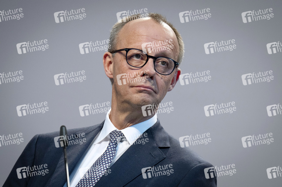 Friedrich Merz bei der Pressekonferenz von CDU, CSU und SPD zur Vorstellung des gemeinsamen Koalitionsvertrages im Paul-Löbe-Haus. Berlin, 09.04.2025
