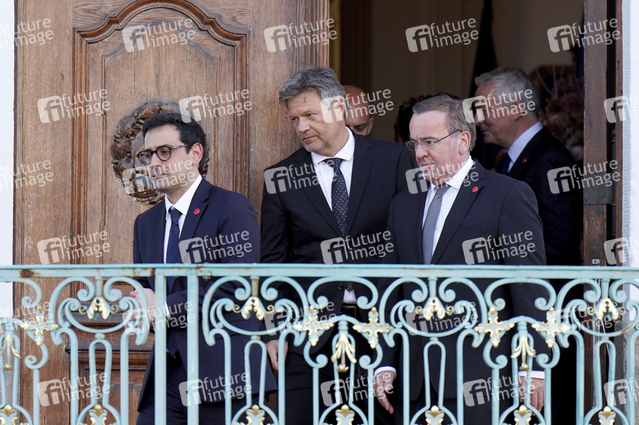 Stephane Sejourne, Robert Habeck und Boris Pistorius beim Treffen des Deutsch-Französischen Ministerrats im Gästehaus der Bundesregierung Schloss Meseberg. Meseberg, 28.05.2024