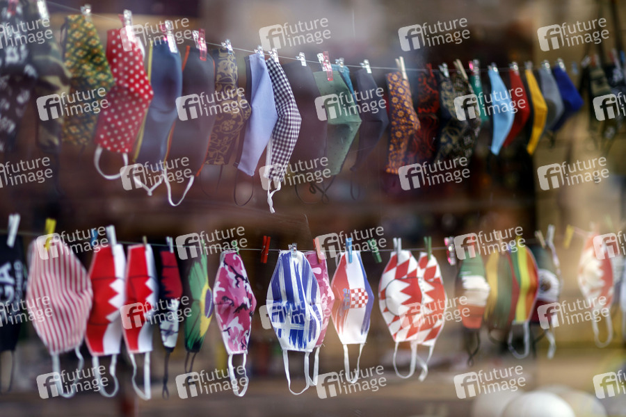 Die Stadt Nürnberg hat den Corona-Grenzwert von 50 überschritten. Damit gelten zahlreiche Maßnahmen für die Bürgerinnen und Bürger, die am Freitag vorgestellt wurden. Unter anderem gilt ab Samstag eine Maskenpflicht in der Innenstadt. Im Bild selbstgeschneiderte Stoffmasken im Schaufenster einer Schneiderei in Nürnberg. (Themenbild, Symbolbild) Nürnberg, 16.10.2020