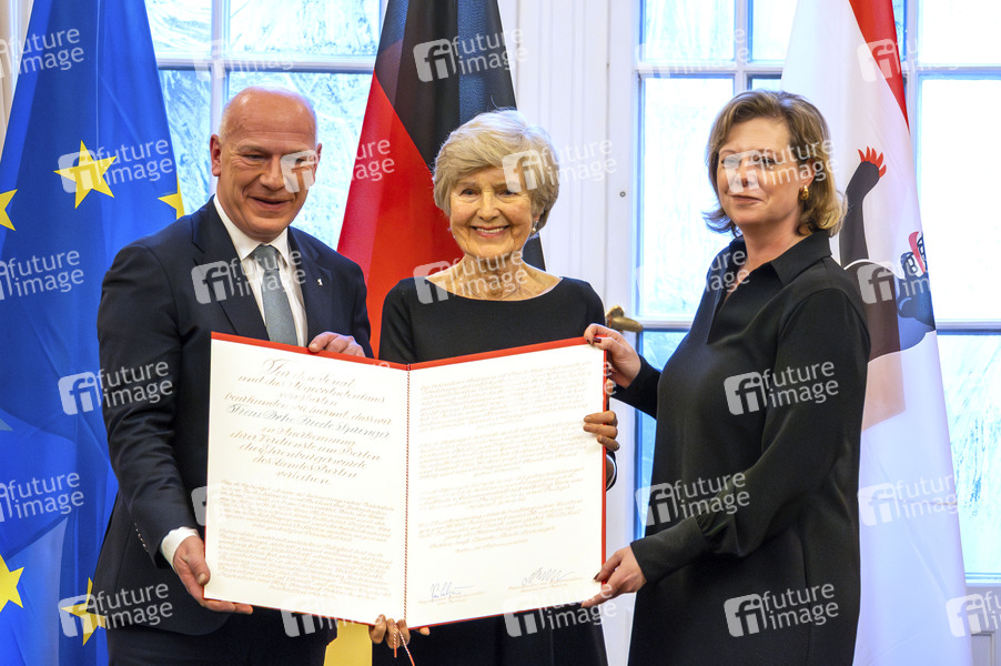 Kai Wegner, Friede Spriner und Cornelia Seibeld bei der Verleihung der Ehrenbürgerwürde an Friede Springer im Festsaal Rotes Rathaus. Berlin, 26.02.2025