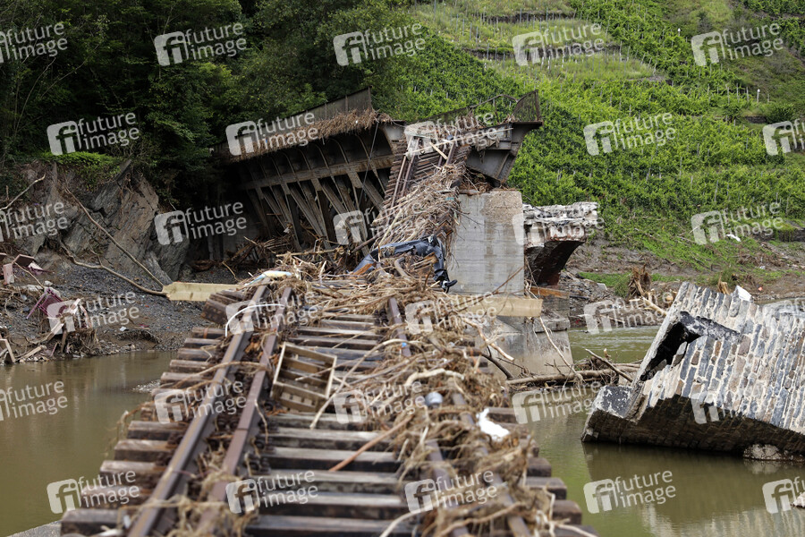 Nach dem Jahrhunderthochwasser in der Eifel durch heftige Regenfälle und Dauerregen mit Überschwemmungen und Überflutungen haben die Aufräumarbeiten im Ahrtal große Fortschritte gemacht. Einheiten von Polizei, THW, Bundeswehr und Feuerwehr mitsamt vielen freiwilligen Helfern haben Straßen geräumt, Schutt und Schlamm entfernt und die Menschen versorgt. Der Wiederaufbau wird trotzdem Jahre dauern. Im Bild Flutschäden an einer Brücke zwischen Rech und Mayschoß, die durch die Flut beschädigt wurde, 08.08.2021