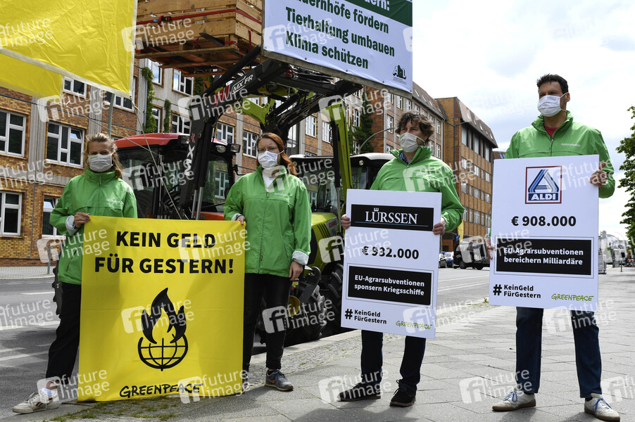 Aktivisten von Greenpeace und Landwirte demonstrieren vor dem Bundesministerium für Ernährung und Landwirtschaft gegen unfaire Subventionen und die europäische Agrarpolitik. Berlin, 28.05.2020