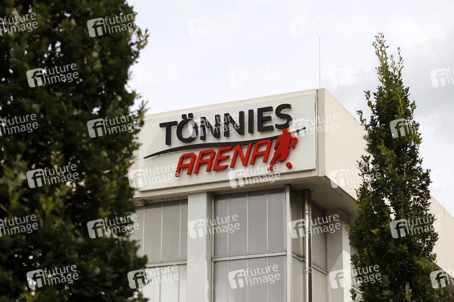 Schriftzug der Tönnies Arena, einem Fußballstadion am Hauptsitz der Firma Tönnies in Rheda-Wiedenbrück. Der Fleisch-Konzern will die Schlacht- und Zerlegefirma Lazar übernehmen. Rheda-Wiedenbrück, 02.08.2020