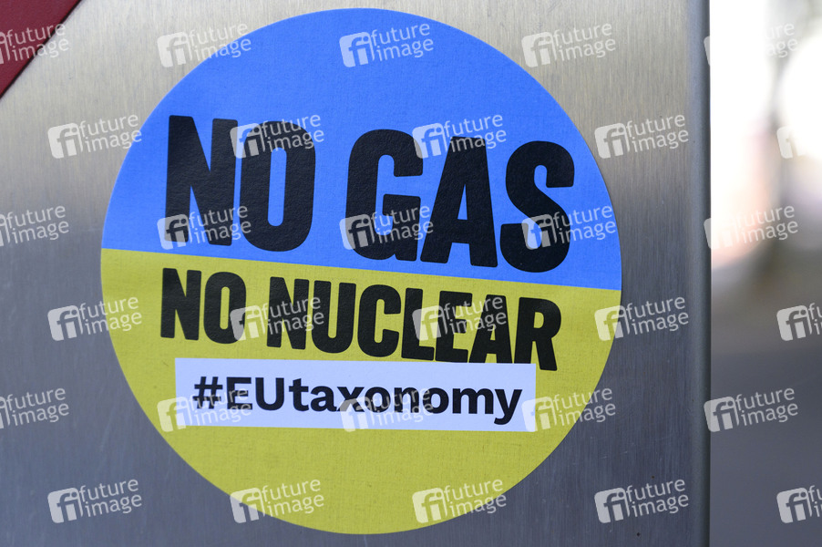 Aufkleber als Protest zum delegierten Taxonomie-Rechtsakt über Kernenergie und Gas. Das Mehrheit der EU-Parlament hat dafür gestimmt, Investitionen in Gas- und Atomstrom unter bestimmten Bedingungen als nachhaltig zu klassifizieren. Damit folgt sie dem Vorschlag, den die Europäische Kommission Anfang Februar als ergänzenden delegierten Rechtsakt Straßburg, 06.07.2022