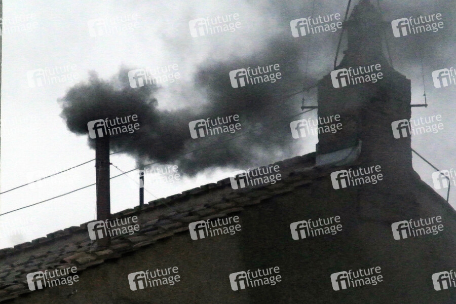 Schwarzer Rauch steigt aus dem Schornstein der Sixtinischen Kapelle, der anzeigt, dass die Kardinäle noch zu keinem Ergebnis bei ihrer Papstwahl gekommen sind. Vatikanstadt, 13.03.2013