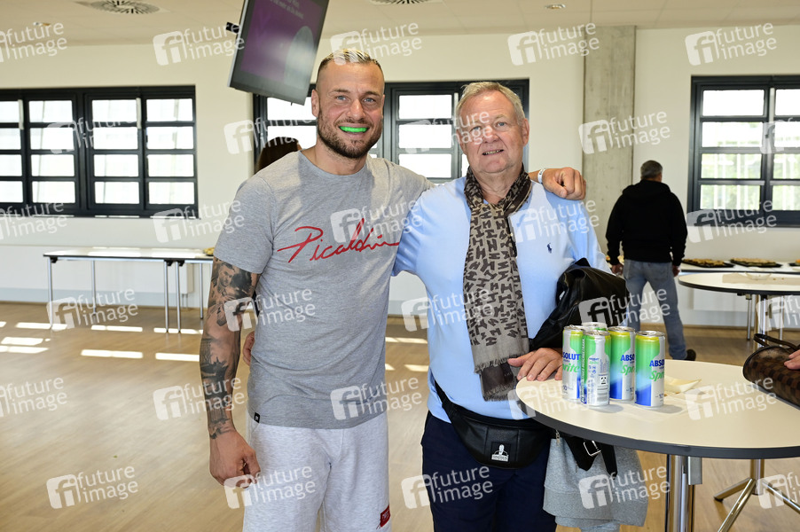 Eric Sindermann mit Vater Thomas Sindermann beim Benefiz Cup Dresden 2025 – Fussball für einen guten Zweck im Heinz-Steyer-Stadion. Dresden, 28.09.2025