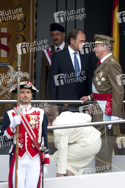 Die spanische Königsfamilie bei der Hommage an die Nationalflagge mit Militärparade am Palacio Real, Madrid