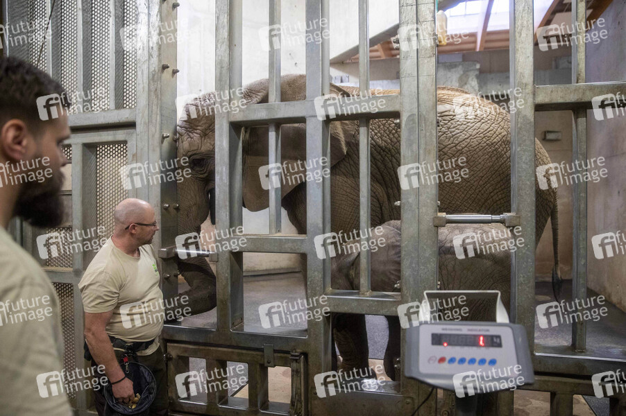 Elefanten bei der Inventur mit Wiegen und Vermessung der Tiere im Thüringer Zoopark Erfurt. Erfurt, 18.01.2022