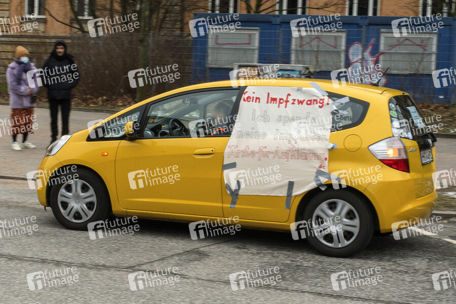 Unter dem Motto 'Wie wollen wir das schaffen?' fährt ein Autokorso der selbst ernannten 'Freiheitsfahrer' mit rund 200 Autos hupend durch die Stadt. Hamburg, 06.02.2021