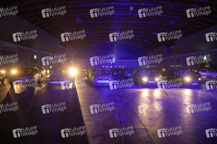 Konzertbesucher beim Radio 7-Autokino Konzert von Glasperlenspiel in der Zeppelin Cat Halle der Messe Friedrichshafen. Friedrichshafen, 27.05.2020