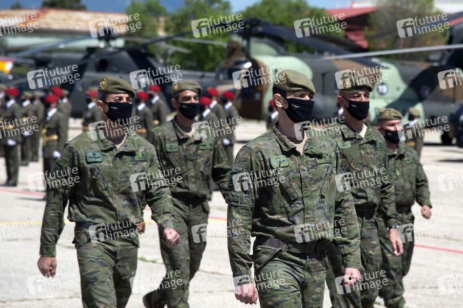 Soldaten bei der Zeremonie der Übergabe der Nationalflagge an die ACAVIET (Luftfahrtakademie der Armee) in der Helipuerto Base Coronel Mate. Colmenar Viejo, 07.05.2021