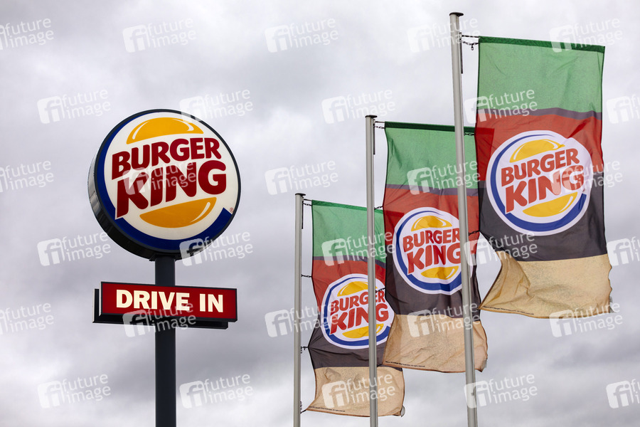 Burger, Burger King, Fast Food, Fastfood, Whopper, Restaurant, DriveIn, Drive In, Drive-in, Drive-thru, Schnellrestaurant, Ernährung, Fritten, Softdrinks, Cola, Sparmenü, Cheeseburger, Hamburger, Ketchup, Majo, Schnellrestaurantkette, Systemgastronomie, Franchising, Konkurrenz, Filiale, Logo, Mahlzeit, Kalorien, Fett, gesunde Ernährung, Ernährungspyramide, Fast-Food-Kette, Fahne, Flagge, Symbolbild, Symbolfoto