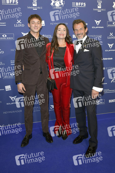 Hans-Werner Meyer mit Ehefrau Jacqueline Macaulay und Sohn Callum Macaulay bei der Verleihung des Deutschen Schauspielpreises 2025 im Hotel Pullman Berlin Schweizerhof. Berlin, 09.10.2025