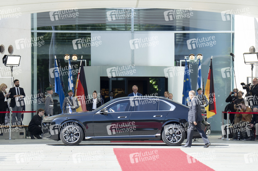 Friedrich Merz beim Empfang des Ministerpräsidenten von Griechenland mit militärischen Ehren und zu einem gemeinsamen Gespräch mit anschließendem Pressestatement im Bundeskanzleramt. Berlin, 13.05.2025