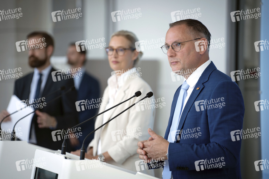 Alice Weidel und Tino Chrupalla beim Pressestatement anlässlich der Fraktionsklausur der AfD mit der Vorstellung eines Positionspapiers im Reichstagsgebäude. Berlin, 05.07.2025
