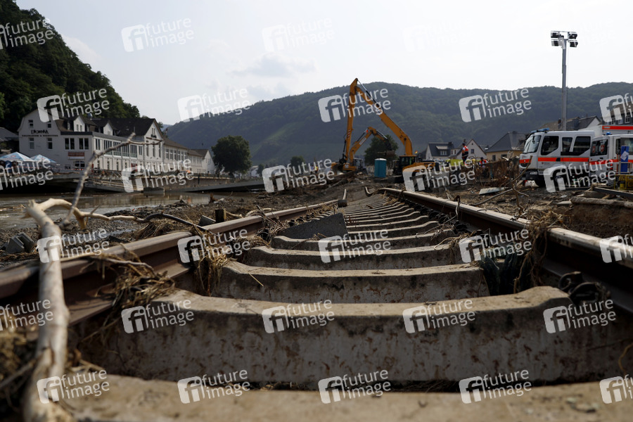 Nach dem Jahrhunderthochwasser in der Eifel durch heftige Regenfälle und Dauerregen mit Überschwemmungen und Überflutungen haben die Aufräumarbeiten im Ahrtal begonnen. Einheiten von Polizei, THW, Bundeswehr und Feuerwehr mitsamt vielen freiwilligen Helfern räumen Straßen, entfernen Schutt und Schlamm und versorgen die Menschen. Im Bild zerstörte Bahngleise in der Ortschaft Dernau, in der die Flut viele Häuser zerstörte, 22.07.2021