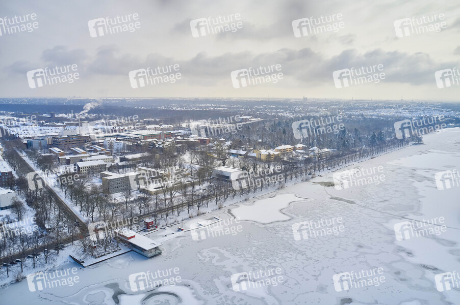 Luftbild vom zugefrorenen Maschsee und der Südstadt im Winter. (Der Drohnenflug wurde ordnungsgemäß bei der Polizei Leitstelle Hannover angemeldet) Hannover, 09.02.2021