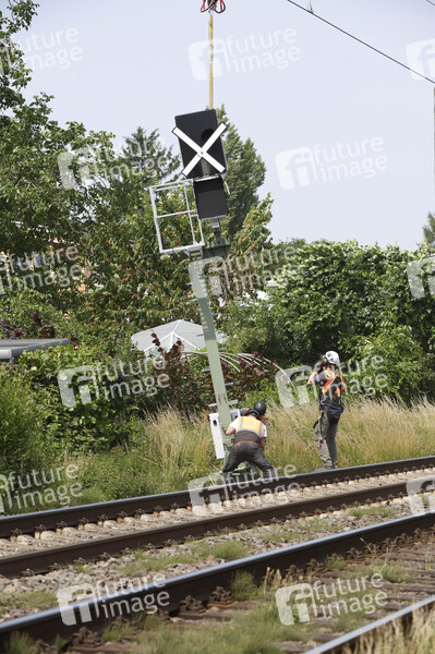 Mitarbeiter bei der Signalinstallation beim Fototermin 'Helikopter fliegt Signalmaste für das neue Elektronische Stellwerk in Bonn-Beuel ein'. Es beginnt letzte große Bauphase vor der Generalsanierung der rechten Rheinstrecke im Jahr 2026. Mit Hilfe eines Helikopters werden knapp 50 Signalmaste für das neue ESTW Bonn-Beuel eingeflogen. Bonn, 14.06.2025