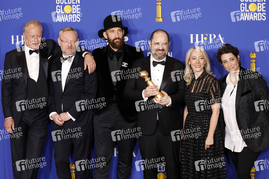 Stellan Skarsgard, Jared Harris, Johan Renck, Craig Mazin, Jane Featherstone und Carolyn Strauss mit dem Preis für die beste Mini-Serie 'Chernobyl' bei der Verleihung der 77. Golden Globe Awards im Beverly Hilton Hotel. Beverly Hills, 05.01.2020