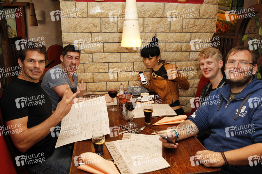 Brett R. Miller, Laurence Wreford, Bai Ling, Paul Skupin und Tom Jeschke in einem Restaurant in der Altstadt bei einem Besuch in Düsseldorf, 29.05.2014