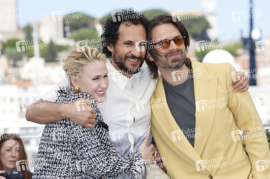 Maria Bakalova, Ali Abbasi und Sebastian Stan beim Photocall zum Kinofilm 'The Apprentice' auf dem Festival de Cannes 2024 / 77. Internationale Filmfestspiele von Cannes am Palais des Festivals. Cannes, 21.05.2024