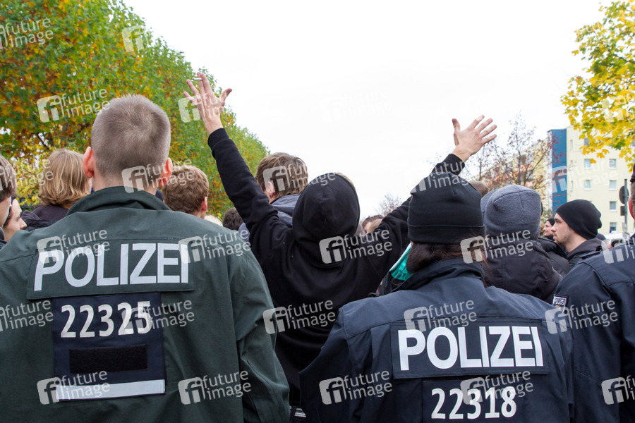 Die 'Bürgerinitative Marzahn-Hellersdorf' wollte vom U-Bahnhof Neue Grottkauer Straße durch den Bezirk marschieren, um gegen das Flüchtlingsheim zu protestieren. Doch Gegendemonstranten verhinderten mit einer Sitzblockade, dass der Zug zu seinem Ziel kam. Berlin, 26.10.2013